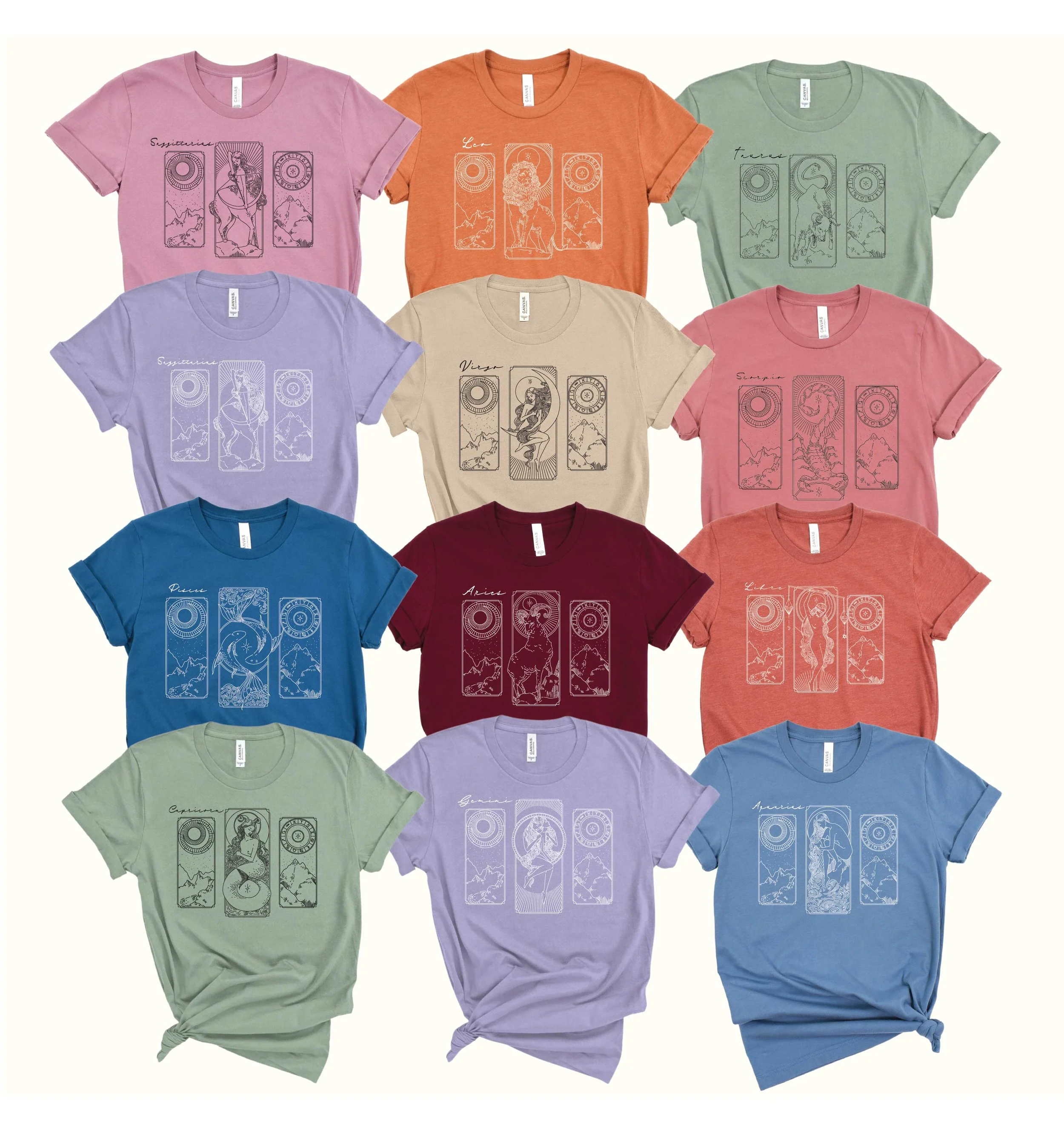 These beautiful tees feature detailed drawings of each zodiac sign paired with beautiful, peaceful mountains!